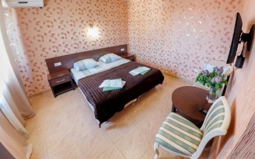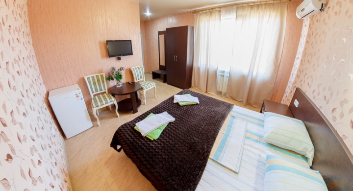 Номер стандарт двухместный - Это номер с индивидуальным дизайном, возможностью дополнительного места для ребенка, площадь номеров по 15 кв.м. Все номера оснащены современной мебелью, бытовой техникой (телевизор, холодильник, кондиционер), для удобства гостей в номере есть сейф с кодовым замком. В номере санузел.