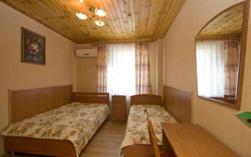 Номера рассчитаны на трёх человек, в каждом номере есть: двуспальная и односпальная кровати, холодильник, ТВ, сплит-система, тумбочки, шкаф, небольшой столик, зеркало, туалет и раковина (холодная вода). Две душевые для всех шести номеров "стандарт" находятся на первом этаже (горячая и холодная вода круглосуточно). В номер можно поставить доп. место - раскладушку. Выход из номеров на втором этаже - на общий балкон. Окна деревянные, вид из окон на втором этаже - в сторону моря."