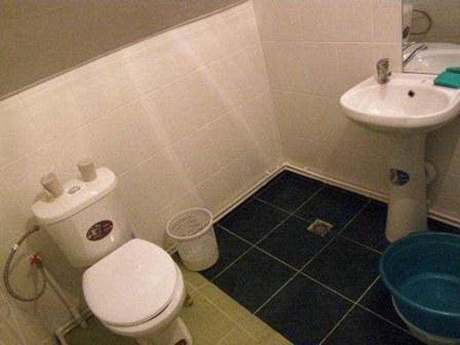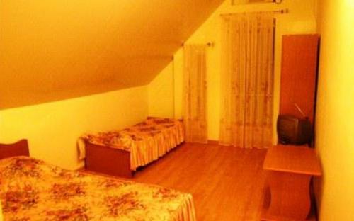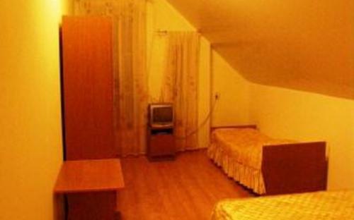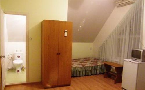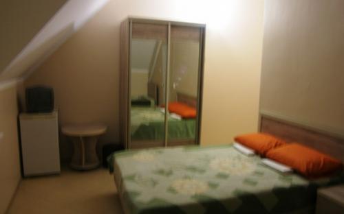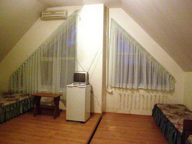Еще есть подешевле на мансарде два номера с общим душем и туалетом на блок из двух номеров рассчитаны на три человека каждый при условия проживания семейной пары на двуспальной и ребенка на односпальной кроватях. На этаже свой холл, гладилка, туалет, умывальник и душ. Сплит-системы имеются во всех номерах.
