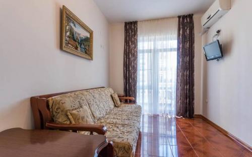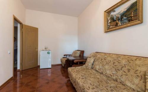 Гостиная — двуспальный диван, кресло-кровать, журнальный столик, холодильник, телевизор.