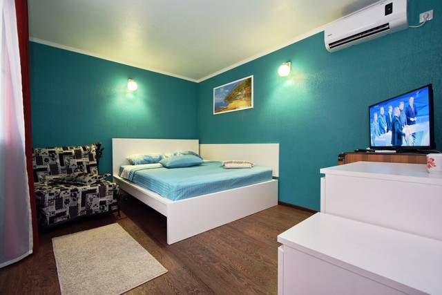 Очень комфортный и просторный номер для большой семьи, с двумя комнатами и отличным видом из окна. В номере: двуспальная кровать, диван раскладывающийся (на два спальных места), кресло-кровать, двустворчатый шкаф для одежды и вещей с зеркальными дверцами и встроенной прихожей с комодом, отдельно комод для белья, прикроватная тумбочка, удобная и вместительная тумба под телевизор, ЖК телевизор Supra 32″ с USB и HDMI выходами (10 каналов), холодильник Indezit, кондиционер, просторный комфортный горячий душ, туалет и раковина для умывания с тумбой. Свежий ремонт и новая мебель. Мы старались чтобы вам было удобно и комфортно отдыхать!