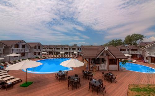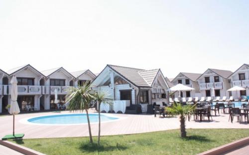 Гостиница выполнена в русском стиле и представляет собой 22 отдельно стоящих двухэтажных домика, расположенных вокруг двух бассейнов с чистейшей морской водой, площадкой для загара и бар бассейном.
