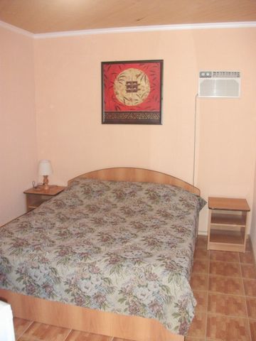 К вашим услугам стильные номер, а так же отдельная беседка. Одна двухспальная кровать, одно (два) кресло-кровати, тумбочки, шкафы, телевизоры, холодильник, кондиционер, а также большая веранда с большим столом и двумя большими лавочками.