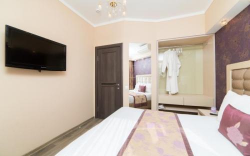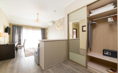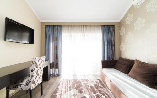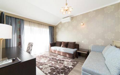 Светлый номер класса люкс с гостиной и спальней. Оборудован всем необходимым для комфортного отдыха: TV плазма и кондиционер в каждой комнате, удобное зонирование, достойный интерьер, дополненный картинами и коврами, создающими атмосферу уюта. Номера с видом на горы и прогулочный парк.