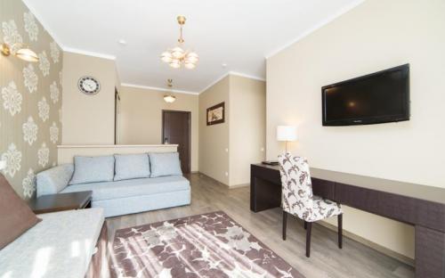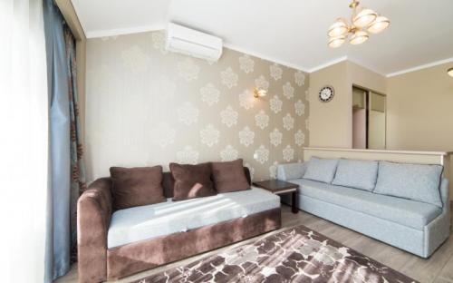 Просторный двухкомнатный номер высшей категории с гостиной, спальней и обеденным уголком. Респектабельность обстановки удовлетворит даже самых взыскательных гостей: TV плазма и кондиционер в каждой комнате, удобное зонирование (зона отдыха, обеденная зона), достойный интерьер, дополненный картинами и коврами, создающими атмосферу уюта.