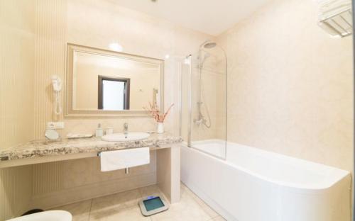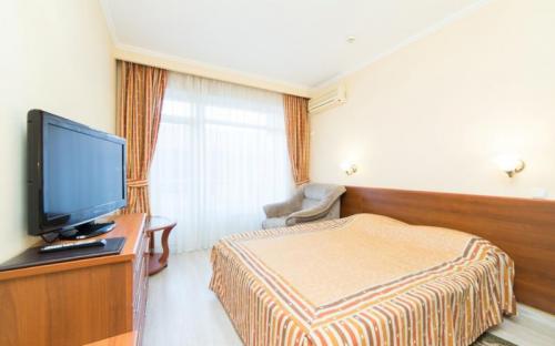 Номер Премиум выделятся наличием трех балконов, открывающих панорамный вид на море, горы и прогулочный парк Курортного городка.