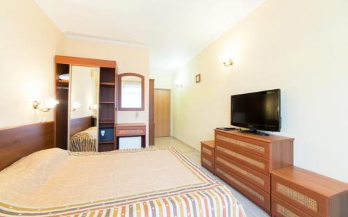 Светлый номер класса люкс с гостиной и спальней. Оборудован всем необходимым для комфортного отдыха: TV плазма и кондиционер в каждой комнате, удобное зонирование, достойный интерьер, дополненный картинами и коврами, создающими атмосферу уюта. Номера с видом на море и прогулочный парк.
