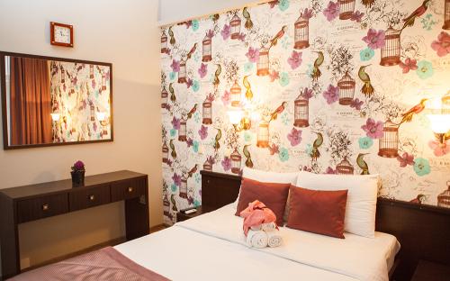 Отдельного внимания заслуживает декоративный внутренний двор, усаженный красочными клумбами, тропическими, диковинными растениями, украшенный рельефными скульптурами. В тени деревьев предпочитают гулять постояльцы, в вечернее время суток гости любят расположиться для отдыха на удобных скамейках мансарды. Прохлада бассейна охладит в зной и жару, открытый бар приятно удивит разнообразием прохладительных напитков.