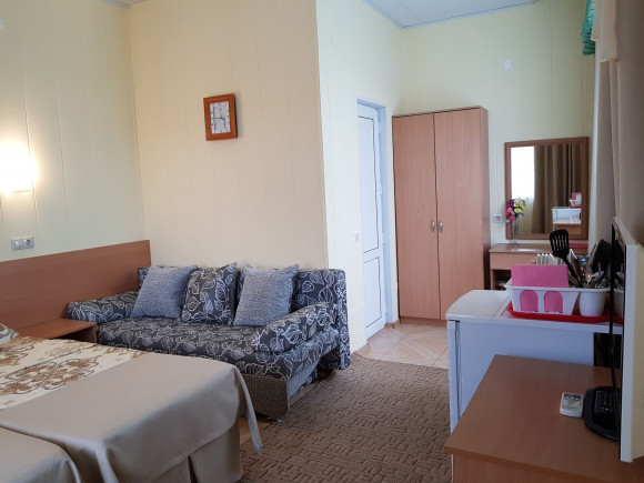 Номера однокомнатные, расположены на 3 этаже. Площадь номера 20 кв.м. Есть балкон смежный на 2 номера. Удобен для отдыха большой компанией или двумя семьями. Балкон один на 2 номера. В данной категории 2 номера. Номера с видом на море.