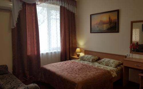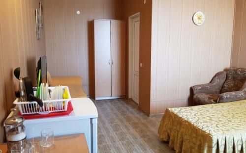 Номера однокомнатные, расположены на 1 этаже в основном корпусе. Площадь номера 20 кв.м. Есть отдельная веранда. Номера выходят на внутренний двор и один номер расположен рядом с бассейнами, кухней, мангалом, беседкой общего пользования. Номеров данной категории - 4.