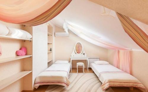 Студия Семейная находится на мансардном этаже, не имеет балкона. Относится к номерам повышенной комфортности. В номере предлагаются тапочки, халаты, средства личной гигиены.
