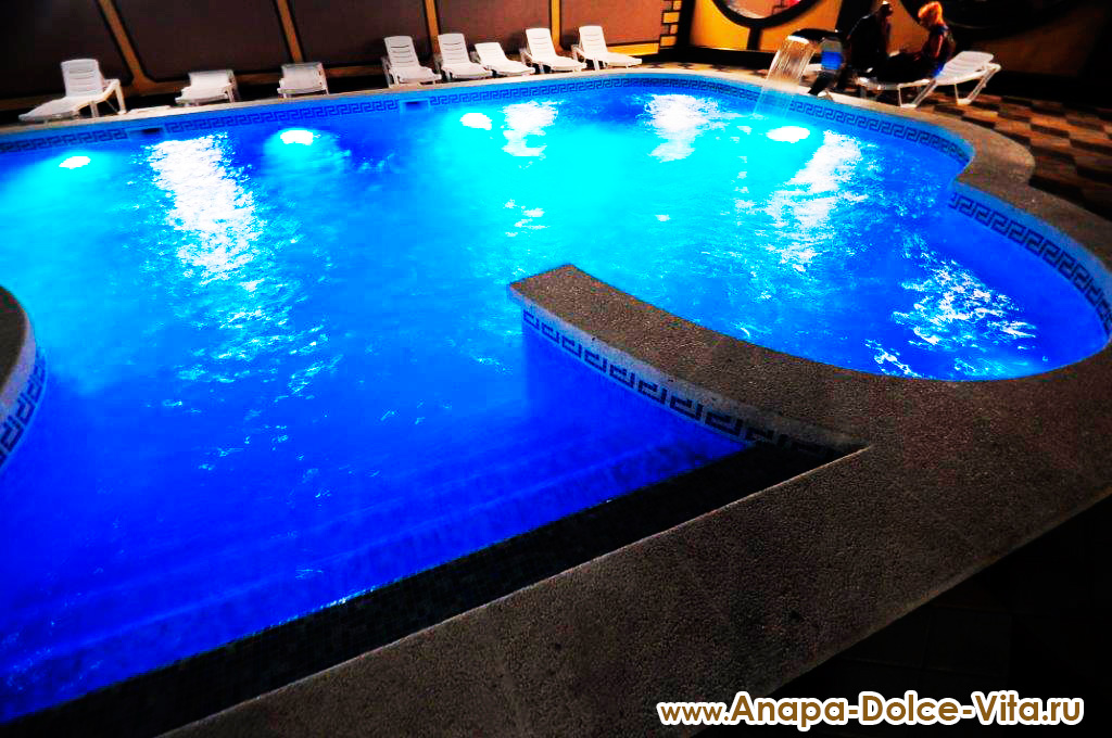 - единственный бассейн в Витязево с подогревом, гидромассажем, джакузи, гейзером, водопадом, детской зоной и ночной цветной подсветкой;